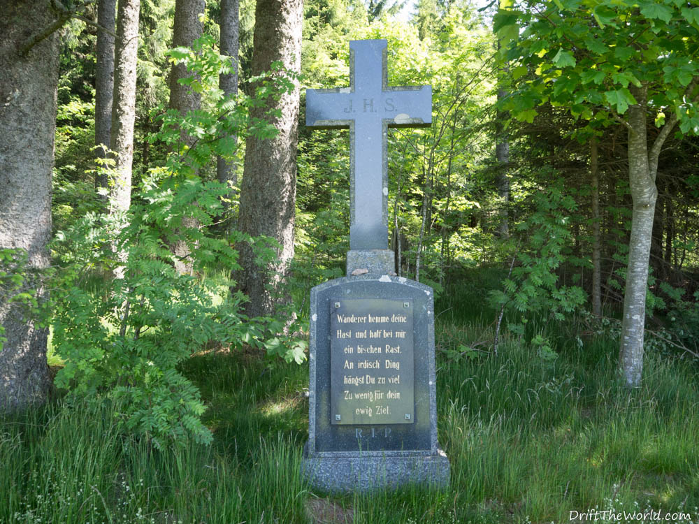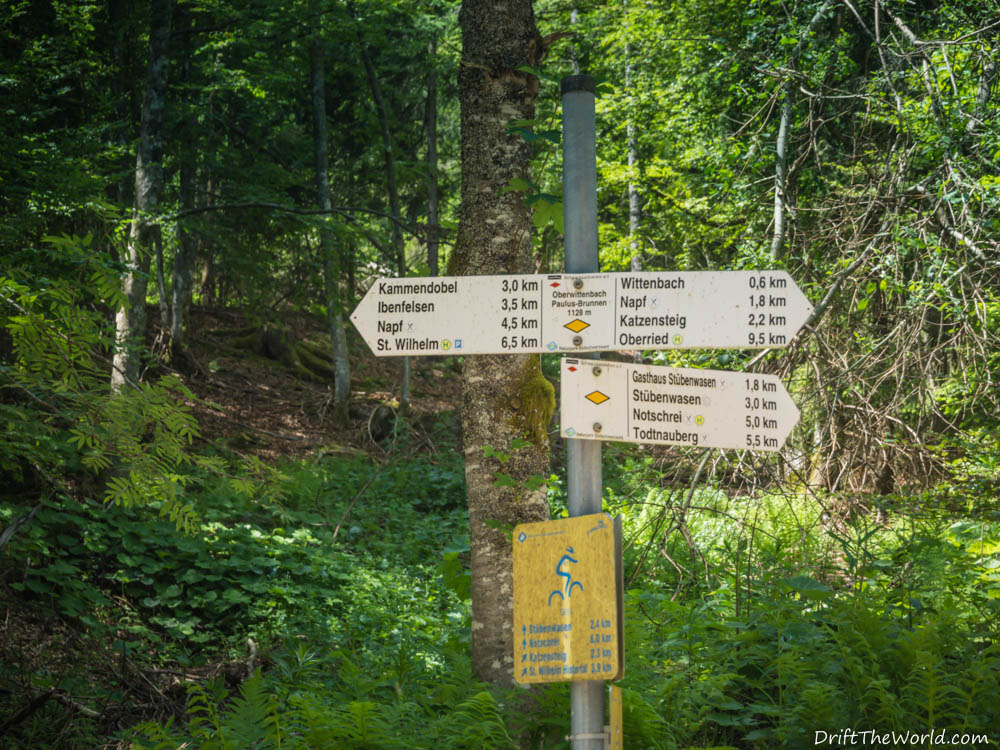 Wir stehen nun also an der Gabelung Stübenwasen – und kein Wasser. Bis Notschrei sind’s noch 5 Kilometer. Nicht die Welt aber ohne Wasser bei 30 Grad … ich will mal sagen BLÖD. Ein Wanderer gibt uns den Tipp Richtung St. Wilhelm zu laufen. Nach circa 1 Kilometer sei auf diesem Weg ein Brunnen mit Trinkwasser. Da es nach St. Wilhelm eher bergab geht fragen wir nochmals nach dem Höhenunterschied. „Es ist nur circa 1 Kilometer und der Weg ist fast eben.“.