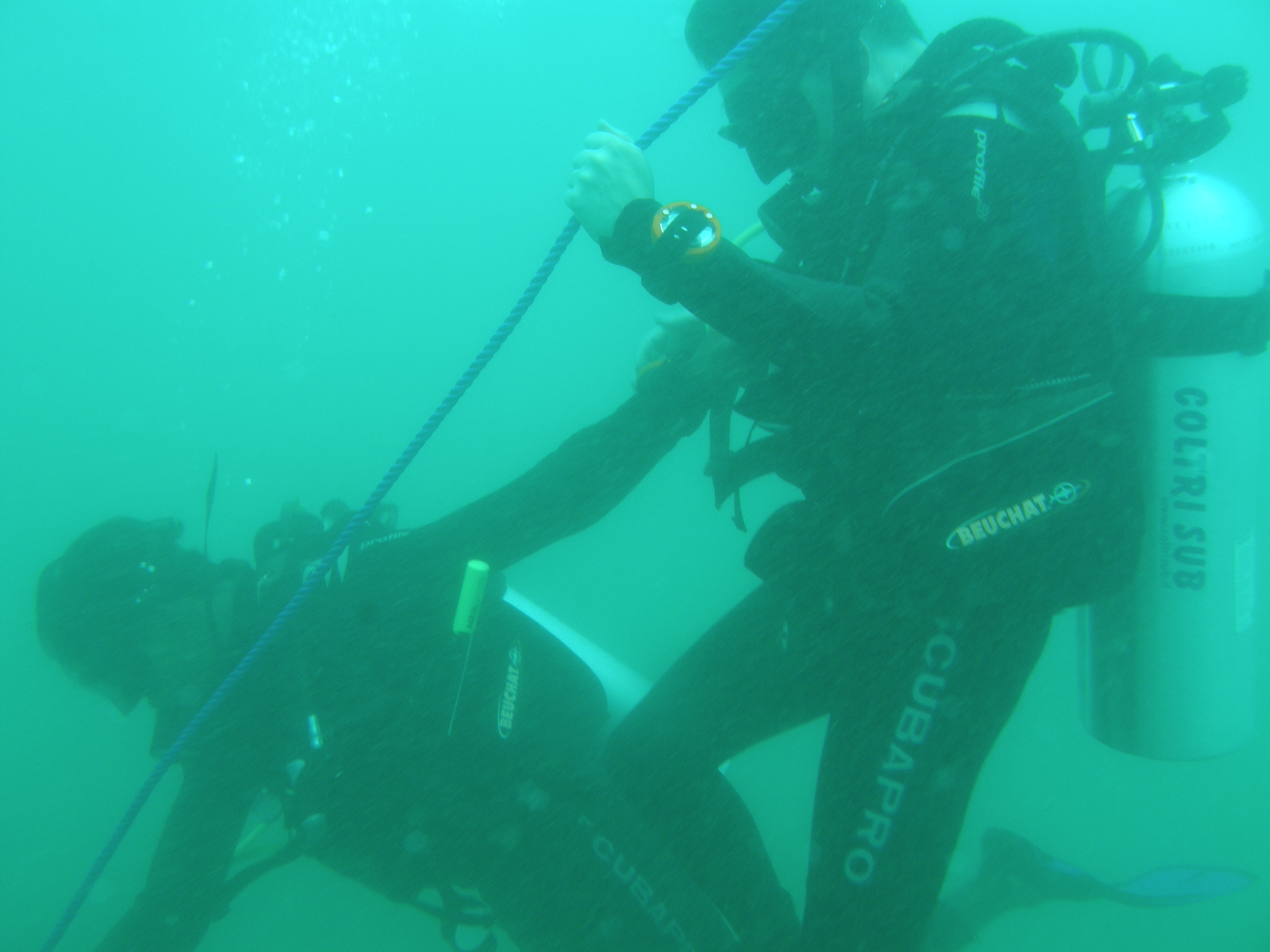 Ein kurzes Zögern bei der Rückwärtsrolle vom Boot ins Wasser – hey hier schon zu scheitern kommt ja wohl mal gar nicht in die Tüte. Geschafft, bin im Wasser und kämpfe mich zum Ankerseil. Die ersten Momente unter Wasser fühlen sich echt verdammt komisch an. Und wieder gibt es dieses kurze Gefühl wo ich echt das Bedürfnis habe auftauchen zu wollen. Aber ich weiss genau, dass es Kopfsache ist und vor allem, dass ich es bereuen würde. Ich versuche also meinen Kopf runterzufahren und mich auf meine Atmung zu konzentrieren. Wenn es wirklich nicht mehr geht kann ich ganz einfach wieder auftauchen, sage ich mir. Und es hilft. Ich tauche nicht auf und absolviere meinen ersten richtigen Tauchgang.